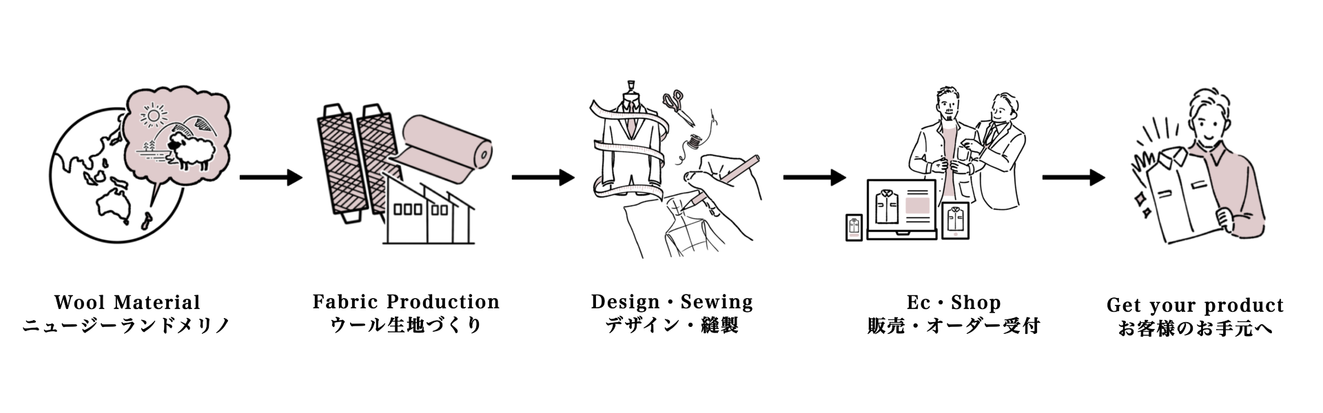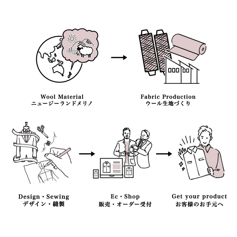 同時に、上質な衣服を永く着る文化をお客様と共に育むことによって、衣服の廃棄問題の解決を促し、上質なウールが、人にも地球にもやさしいことを証明していく。