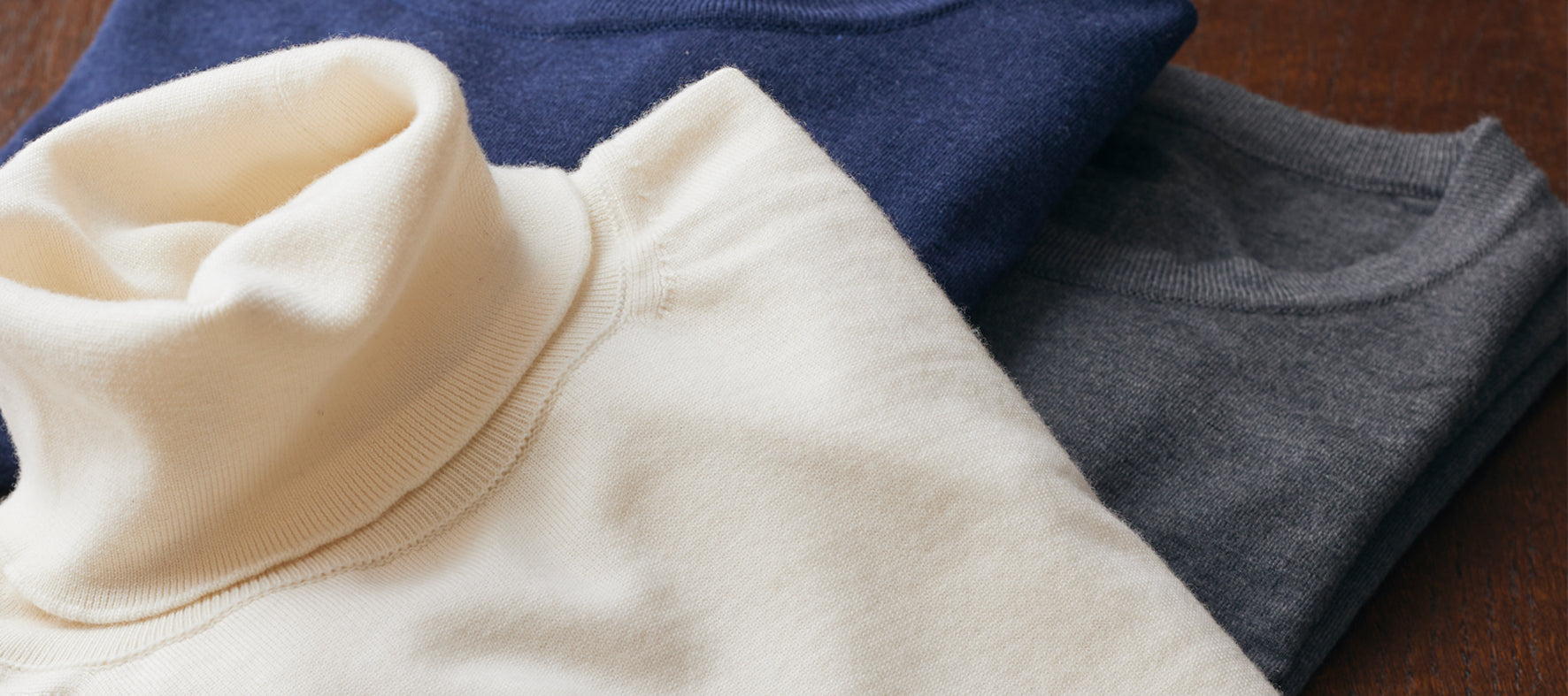 ぜひ一度手に取って極上の着心地をご体験ください。お客様のウールの常識を覆す肌触りは、まるで生クリームや、赤ちゃんの肌のようだという声をいただいております。チクチク感と、日々のケアに関するストレスを取り除いた究極のインナーはとても快適。その上質な見た目から、一枚で着ていただいても様になります。上質さと快適さを兼ね備えたお勧めのアイテムです。