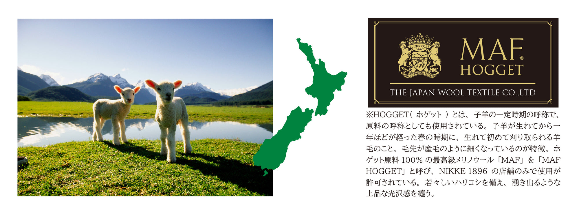 日本毛織の最高級スーツMAF HOGGET(マフ ホゲット)は、世界でNIKKE 1896の店舗でのみ取り扱いされている唯一無二の超希少商品です。原料の仕入れから糸づくり、織物の仕上げ、縫製までをこだわり抜き、NIKKE 1896ブランドの為だけに限定生産されています。ホゲットとは、子羊が生後1年経ち、生まれて初めて刈り取られた初々しい原料のことで、最高品質の極細ホゲット原料を100%使用したNIKKE 1896のスーツにのみ、「マフホゲット」の名称が渡されます。贅沢に原料を使用し、丁寧に時間をかけて紡がれた糸を、ゆっくり時間を掛けて織り、ウール本来のみずみずしい弾力性やハリコシを引き出す匠の仕上げを施されます。他のオーダー店では決して味わえない生地メーカーがとことんこだわった究極の逸品です。湧き出すような異次元の光沢を纏い、繊細ながらもハリコシのあるタッチは繊細な極細ウール素材に堂々とした風格を与えます。著名なエグゼグティブにもご愛用いただいております。