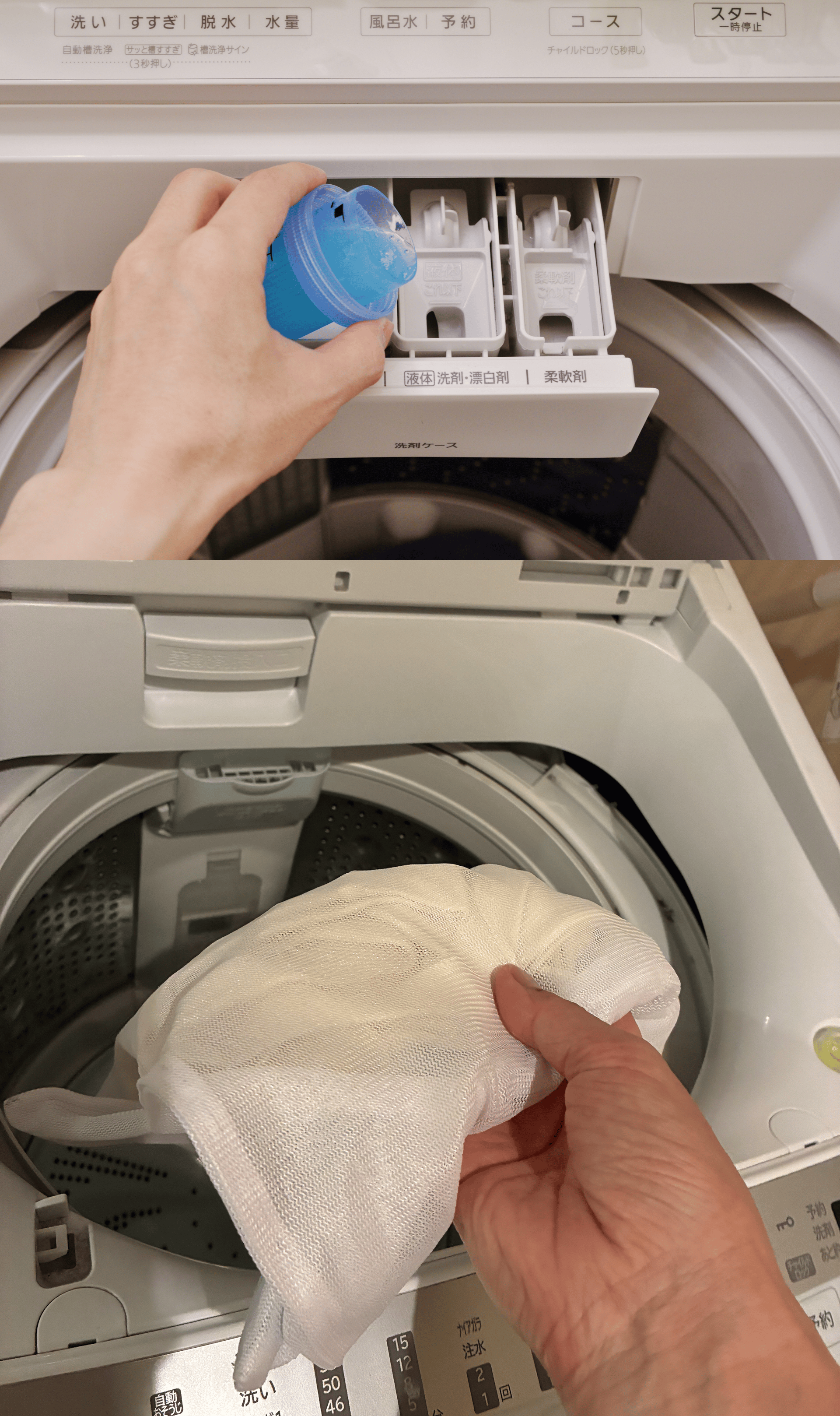 肌に触れている面には皮脂汚れが付着しているため、裏返してからネットに入れることをおすすめします。