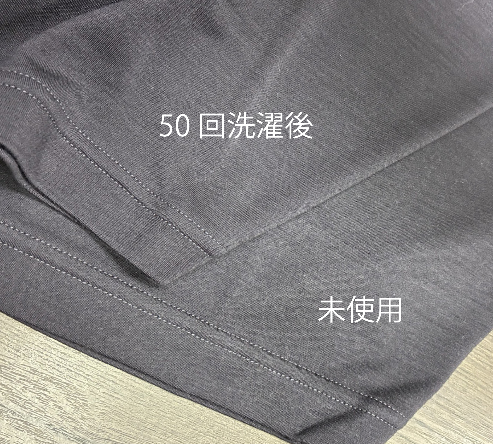 写真は、未使用品と50回洗濯後を重ねて比較したものです。