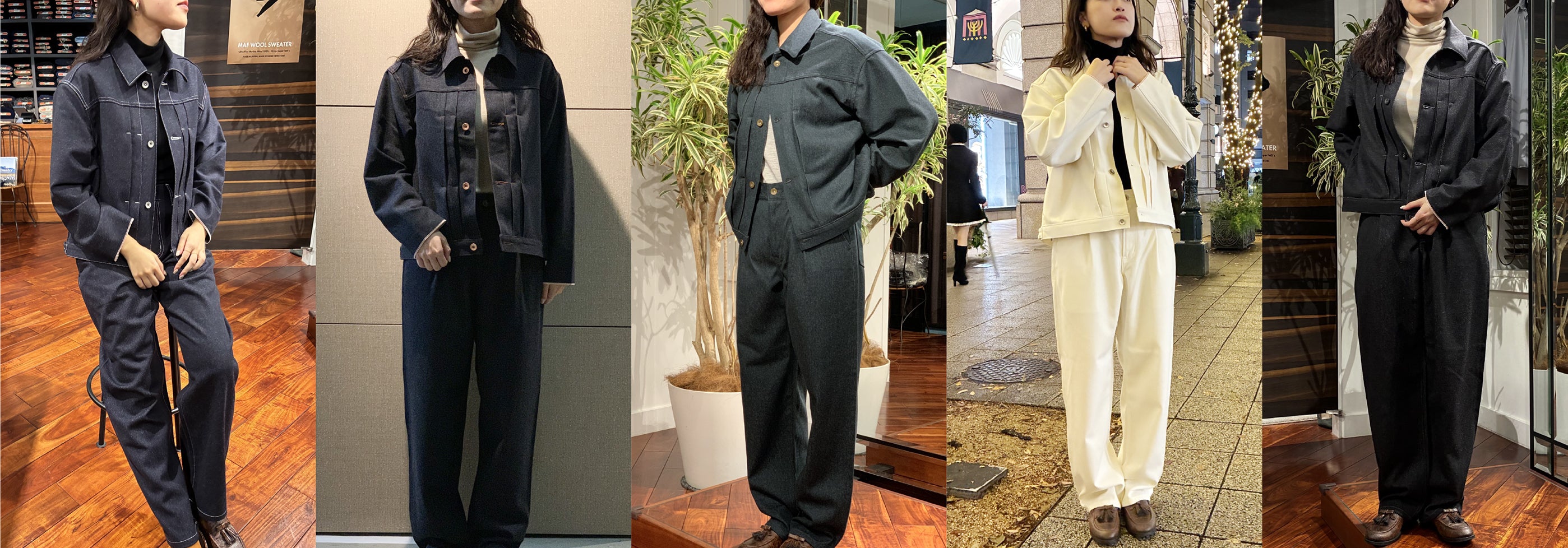 ※春に好評だった水のようにしなやかなウールデニムのシルエットを踏襲し、秋冬生地を使用しています。ステッチも、一部カラーを除きシックな色にまとめています。