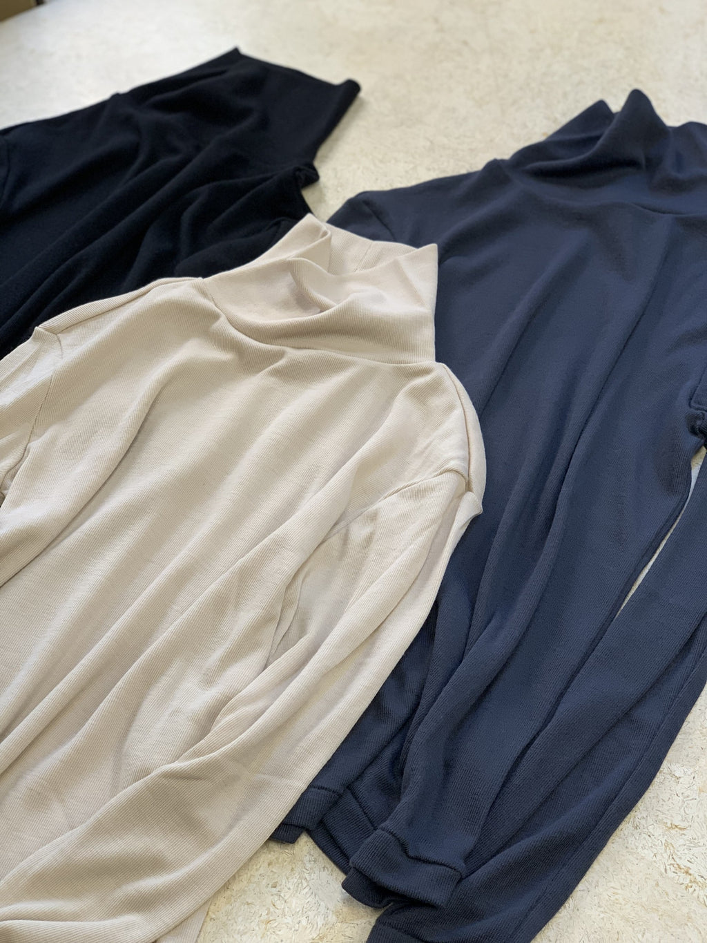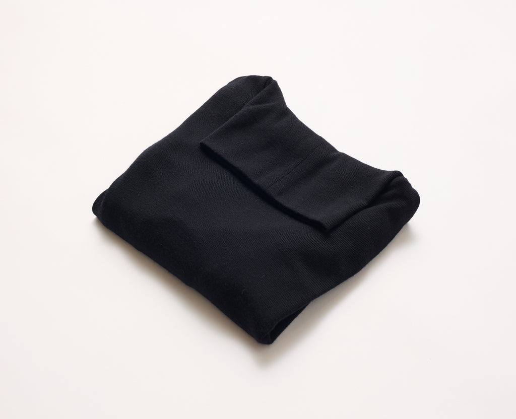 リブ編みという編み方を採用しているので、ふっくらと柔らかな質感で、やさしく体になじむ伸縮性があります。首回りも締め付けがないように設計しています。